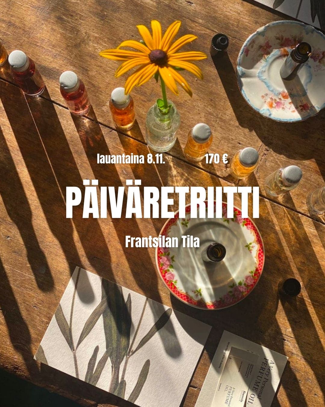Retriitti sisältää kaksi joogaharjoitusta, herkullista kasvisruokaa sekä Frantsilan Annan ohjaaman Scent Lab -tuoksupajan.